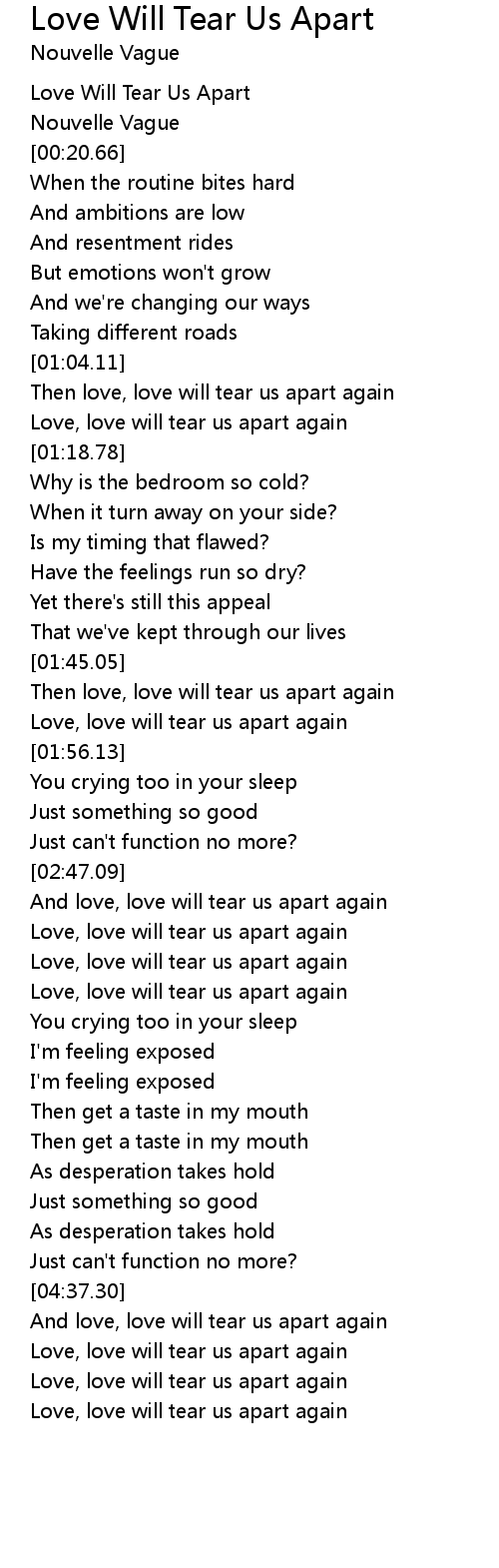 Love will tear us apart - Joy Division (Lyrics), Lyrics from the song "Love will tear us apart" by Joy Division. . We Have got 11 pic about Love Will Tear Us Apart Lyrics images, photos, pictures, backgrounds, and more. In such page, we additionally have number of images out there. Such as png, jpg, animated gifs, pic art, symbol, blackandwhite, pix, etc. "The Cure - Love Will Tear Us Apart (LYRICS ON SCREEN) \ud83d\udcfa", https://www.discogs.com/The-Cure-Burn/release/4101684 The Cure lyric videos (Oldest to Newest): . "Joy Division - Love Will Tear Us Apart (Official Music Video)", New Order & Joy Division Klassiker auf einer Best Of - "Total" kannst du hier bei Amazon bestellen: http://wmg.cc/lsm5nI Willst du ..